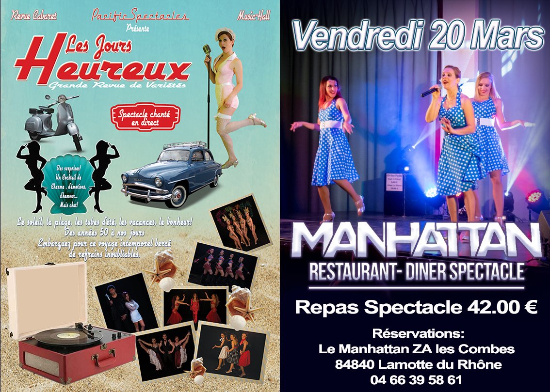Le Manhattan vous propose une soirée Cabaret les jours heureux repas spectacles 42 € 1 kir Entrée : Foie gras Plat : Suprême de poulet et son gratin ou Saumon en papillote Dessert: Roché nacré