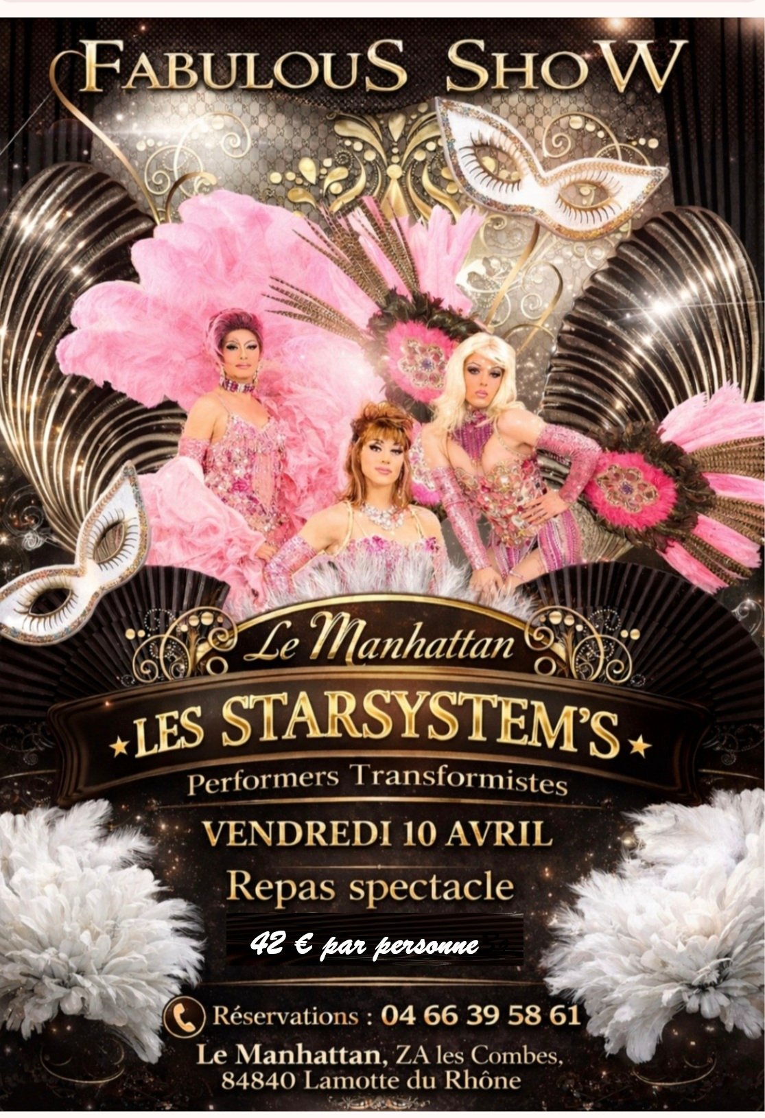 Spectacle Transformistes avec les Starsytem's repas + spectacle 42 € 1 kir Entrée : terrine provençale plat : fricassé de poulet sauce forestière ou Saumon en papillote sauce crevette et son riz Dessert: Palet sablé caramel